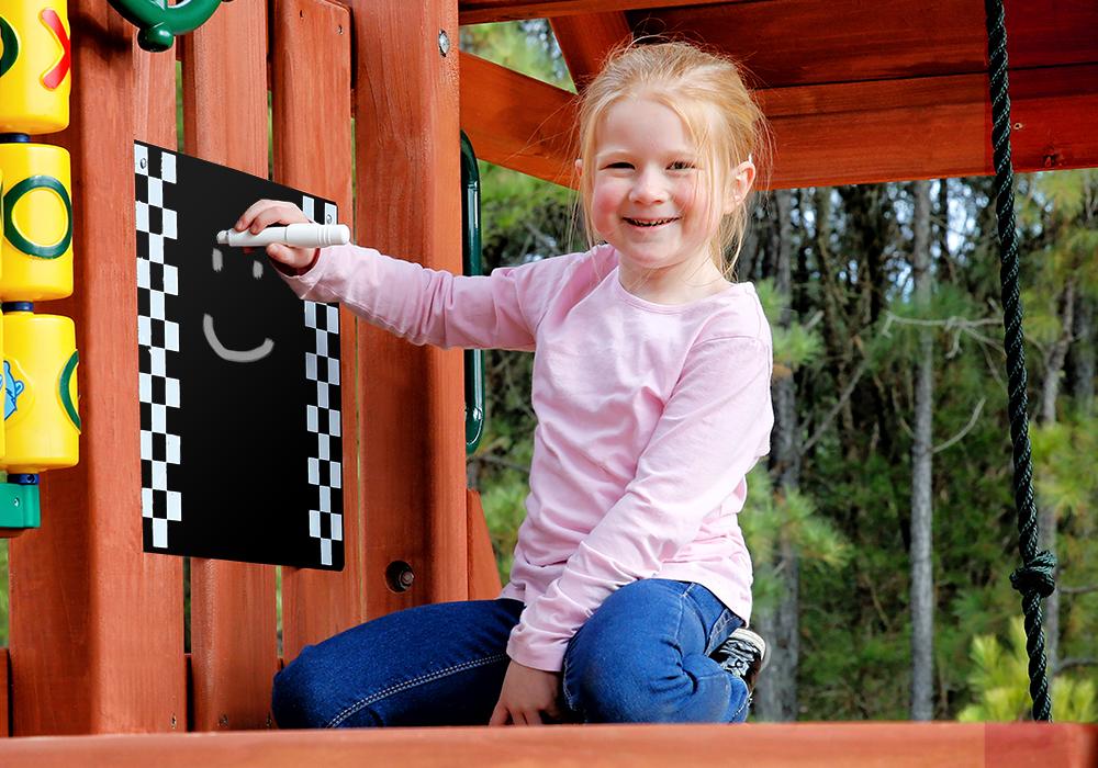 Creative play – built-in picnic table, sandbox, steering wheel, play telescope, jumbo binoculars, Tic-Tac-Toe panel, chalkboard, play telephone, and flag kit